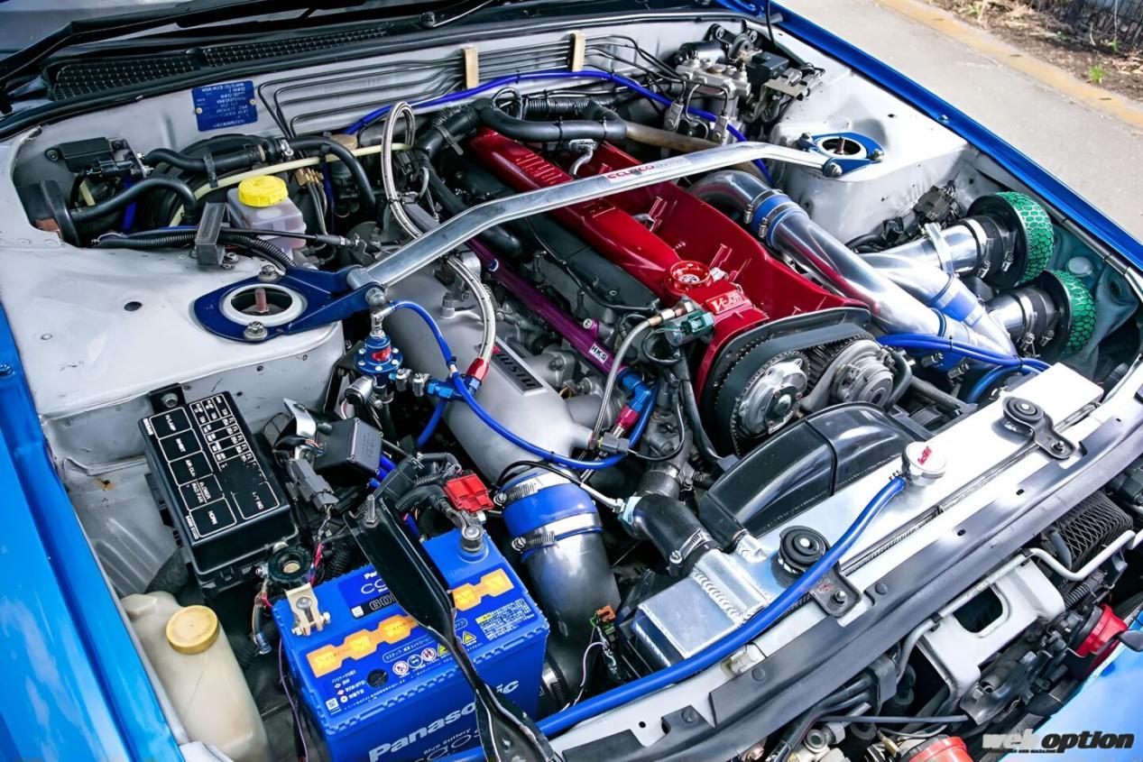 机舱内的RB26DETT已升级至2.8升,并采用了HKS V型凸轮轴系统,以提升低扭和中扭输出。涡轮增压器换装为GT2530Kai双涡轮,使车辆在高转速下也能实现平顺的加速和灵敏的响应。