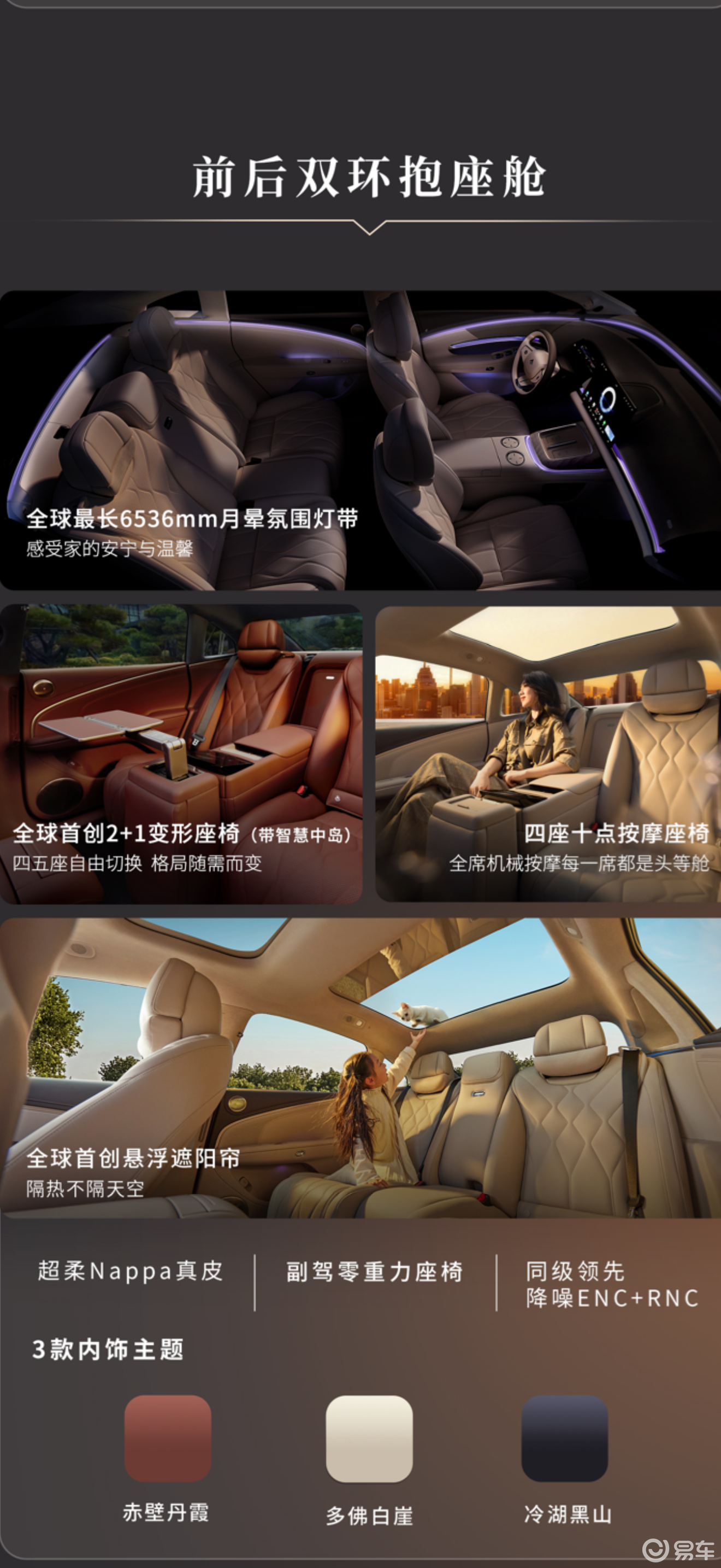 车身长度超过5.3米,1.31倍宽高比带来较宽的视觉效果。内饰有几个细节值得留意:2+1变形座椅配合智慧中岛,可在四座和五座之间切换;6068毫米星环灯带和6536毫米月晕氛围灯带,属于氛围感的加分项;30年花曲柳木饰板、超柔Nappa真皮等用料,在这个价位不算常见。配置上,零重力副驾、机械按摩座椅、三温区冰箱、23扬声器音响、悬浮式遮阳帘等一应俱全。配置丰富是国产车的传统优势,昊铂A800延续了这一特点。