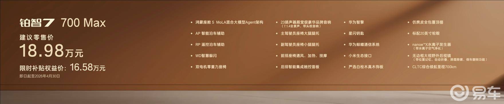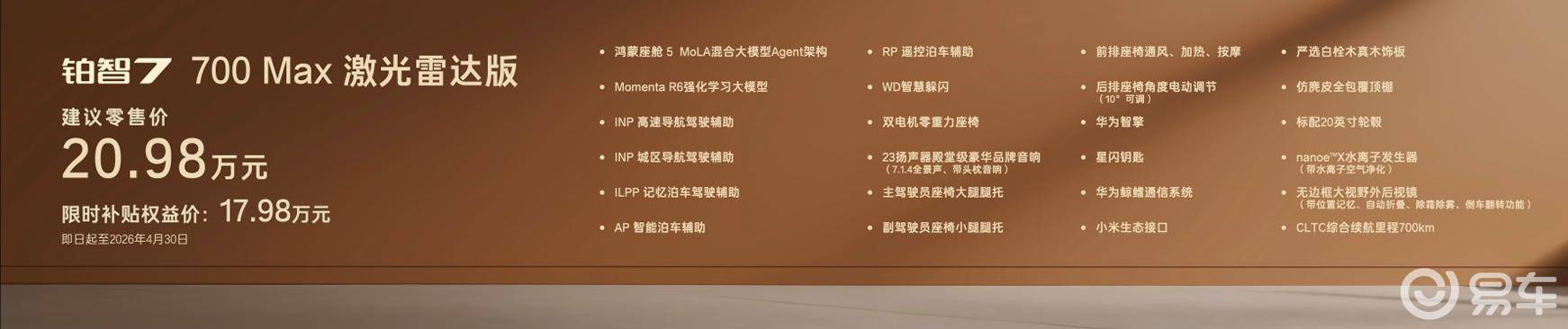 以600 Pro入门版为例,权益后仅14.78万元,却标配了鸿蒙座舱5.0、L2级智能驾驶辅助、97.5%效率的华为智擎多合一高效集成电驱、白栓木实木饰板、前排座椅通风加热、20英寸轮毂等配置。在这个价位区间,你几乎找不到第二款能提供如此全面豪华体验的纯电轿车。用户无需再“选择困难症”,每一款铂智7,都是诚意拉满的“满配”。