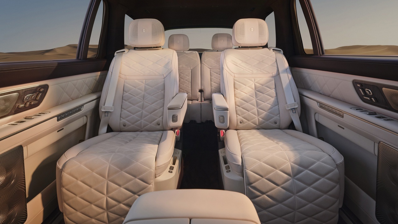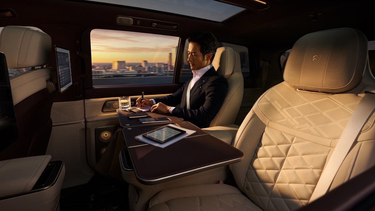 舒适性配置方面,ES9把重点放在第二排。新车搭载蔚来自研高端座椅平台,二排配备飞航零重力行政座椅,椅面长度达到2.3米,并配有覆盖全身的42点深层按摩系统,其中还包含足底按摩功能。与此同时,车内还提供阵列式LC智能隐私调光车窗、双16英寸专属行政屏、高清视频会议系统以及磁吸茶台等配置,整体思路很明确,就是把这台车从传统意义上的“大六座SUV”,进一步拉向“行政接待工具”的使用场景。