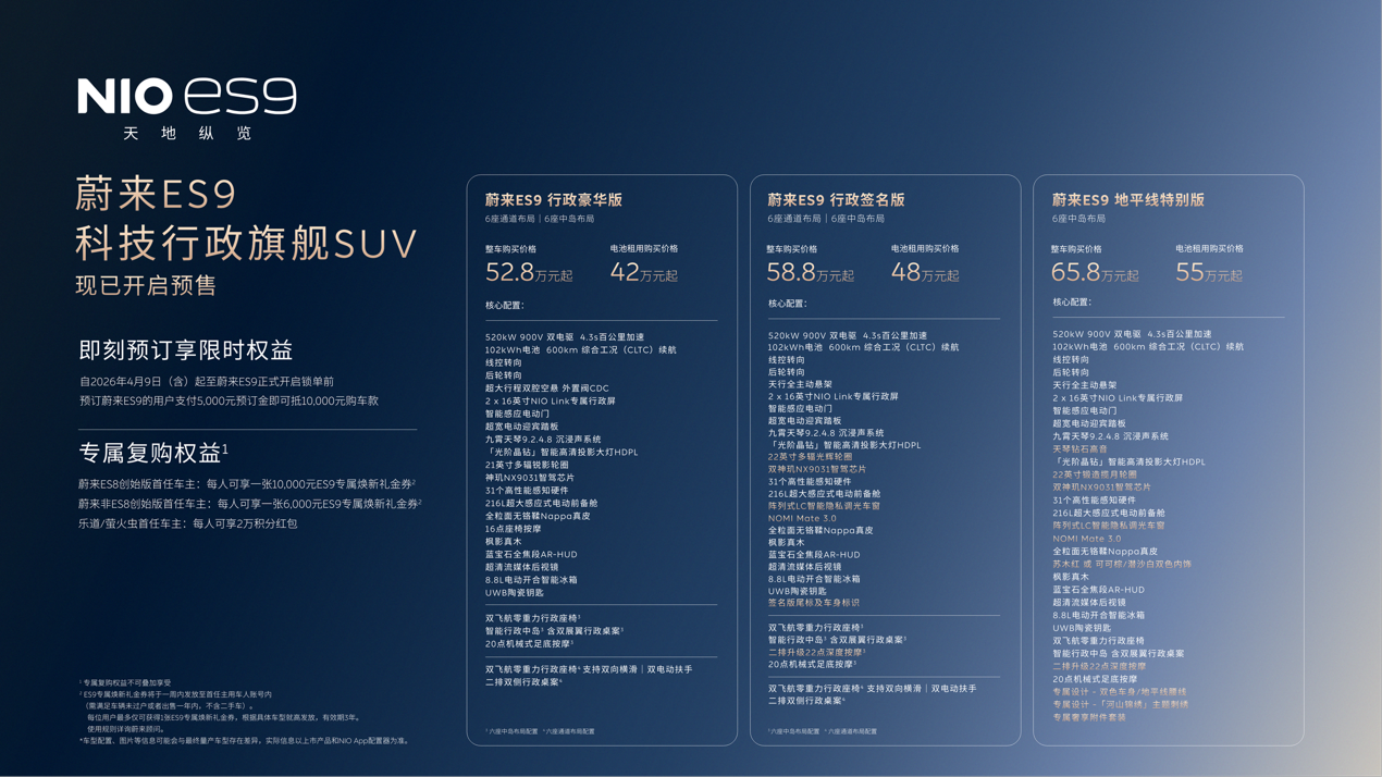 除了产品本身,蔚来此次也同步公布了ES9的预订政策。自2026年4月9日起至正式上市前,用户支付5000元预订金可抵扣10000元购车款。针对老用户,蔚来也推出专属复购权益,其中ES8创始版首任车主可获得10000元焕新礼金券,非ES8创始版首任车主可获得6000元焕新礼金券,乐道和萤火虫首任车主则可获得2万复购积分红包。对于高端新能源品牌来说,这类围绕老用户展开的增换购政策,已经不只是单纯促销,更是强化用户体系和品牌内部流转的重要手段。
