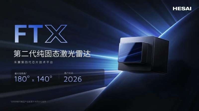 FTX采用纯固态电子扫描技术,实现最大180°x140°视场角,测距达30米@10%反射率,点频49.2万点/ 秒,分辨率较上一代提升超2倍;同时体积大幅优化,重量较上一代减少66%,外露视窗面积仅50×30mm,可灵活嵌入车身,精准检测路桩、宠物等低矮障碍物,助力自动泊车与安全变道。FTX计划于2026年量产,将进一步完善禾赛 “远距 + 近距” 的激光雷达产品矩阵。