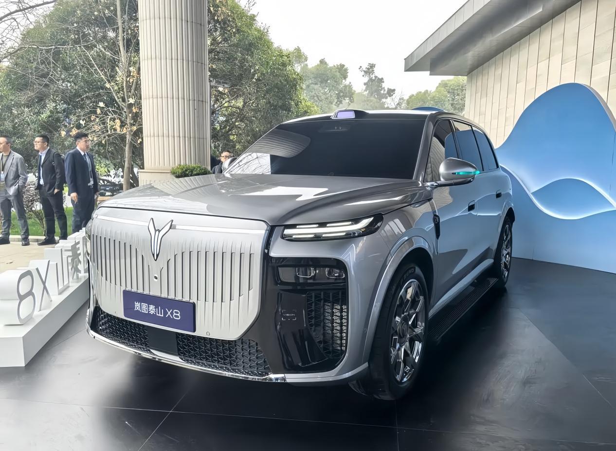 外观方面,泰山X8延续了泰山系列的设计语言。前脸采用封闭式格栅,内部辅以直瀑式元素点缀,格栅与车身同色,有别于现款车型的镀铬装饰。前大灯、下格栅和雷达等部件隐藏在黑色装饰区域。车尾采用贯穿式尾灯组,中央镶嵌“VOYAH”品牌英文标识。侧面配备半隐藏式门把手和22英寸轮毂。