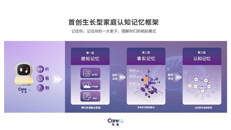 这套体系构建了生长型记忆逻辑。第一是感知记忆,可悠在日常陪伴中捕捉家庭里的每一段对话、每一个生活瞬间,将鲜活日常沉淀为专属原始记忆,融合形成多维感知记忆,完整读懂家庭场景全貌。第二是事实记忆,可悠从海量感知细节中精准提取关键信息,高度概括核心事件,形成长时稳定的事实记忆库,留存每一位家庭成员的专属生活节点与个人细节,不遗漏每一份家庭专属记忆。第三是认知记忆,是一套可实时迭代、动态生长的鲜活记忆体系。它通过数据聚类推演形成完整的家庭群体人物画像图谱,会持续捕捉每一次交互的最新事实与行为变化,实时更新、迭代每位家庭成员的专属记忆,精准适配家人不断调整的喜好、习惯与生活节奏。同时,它更能深度读懂全家动态变化的相处模式,让可悠在朝夕相伴中始终贴合家人的生活轨迹,越用越懂每一位家人。