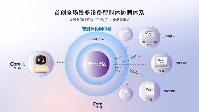 可悠首创全场景多设备智能体协同体系,核心依托“同一个灵魂,不同载体”的底层架构创新,自研智能体协同中枢实现车、家、办公全场景的智能服务无缝衔接,让 AI 真正贯穿用户生活全链路。智能体协同中枢由两大原创核心技术提供支撑。其一是智能体连接(LinkCore),它彻底打通了车机端 NewMember、家用可悠硬件、手机、电脑等全终端设备,让分布在不同场景的智能体分身可彼此感知、建立对话、同步协同工作,实现多终端同步推进任务,打破了设备间的物理壁垒。